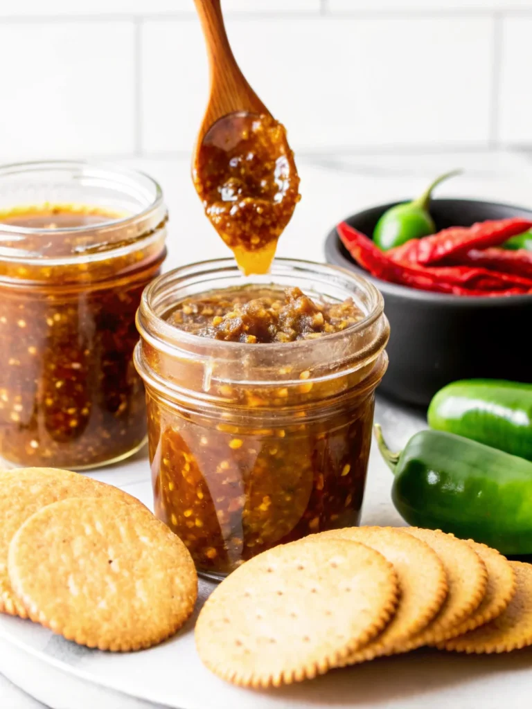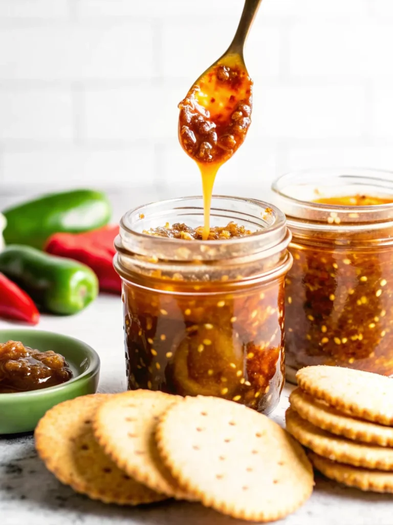 A perfectly balanced jalapeno jam that blends fiery spice with delicate sweetness, creating a versatile condiment ideal for cheese boards, meats, and even desserts.