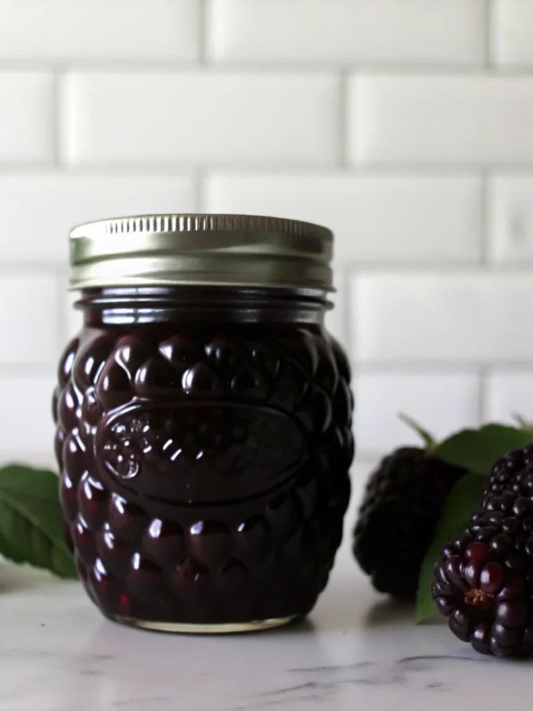 A smooth, seedless blackberry jam made without added pectin, preserving the rich flavor, vibrant color, and nutritional value of fresh summer blackberries.